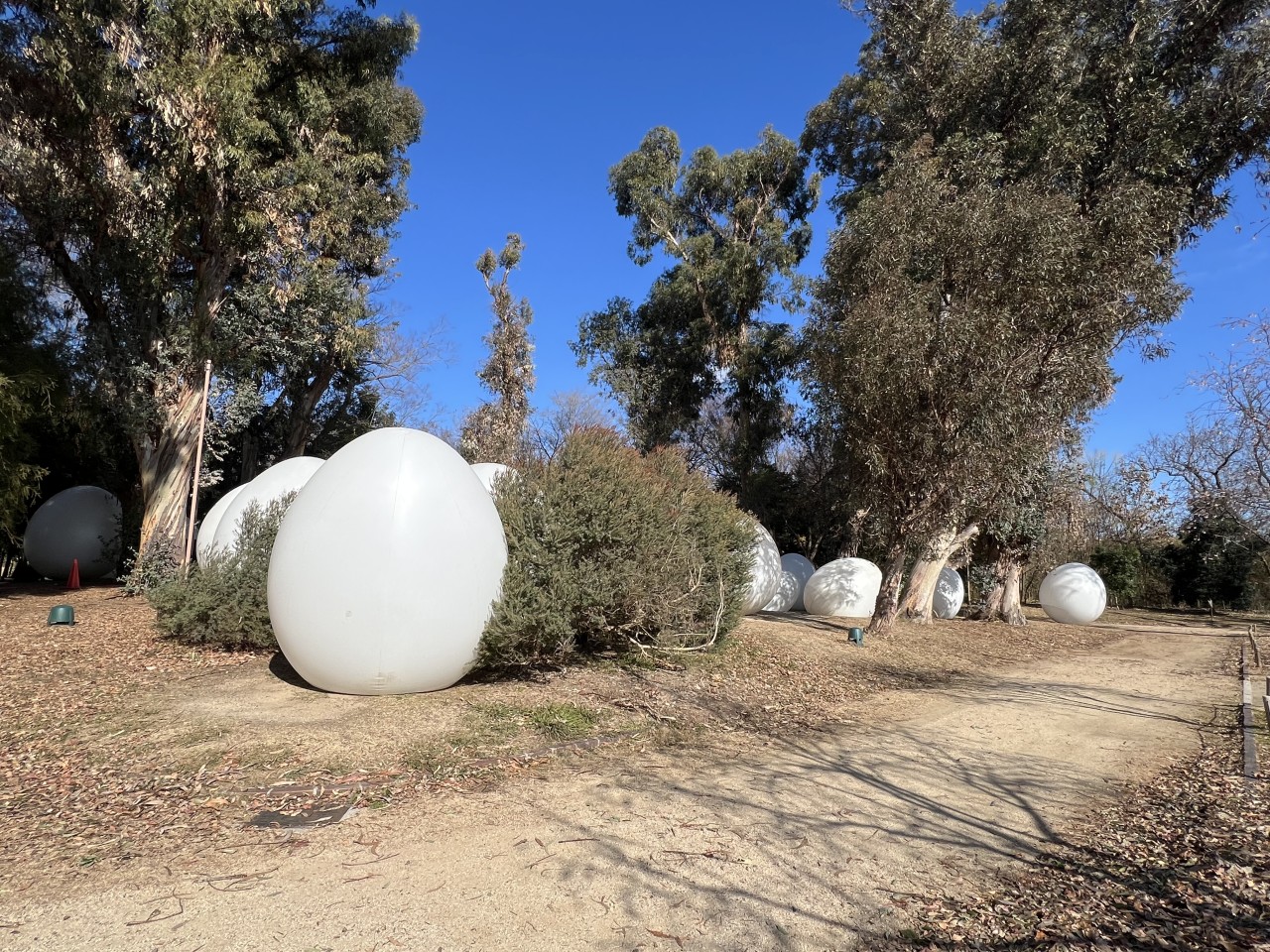 森の中に大きな卵みたいなバルーンやシルバーの卵がいっぱいあって
