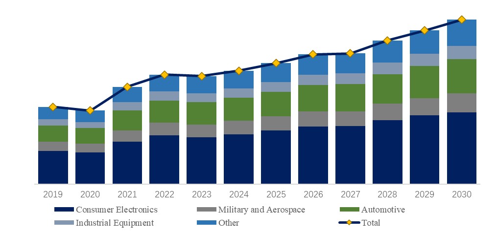 製品用途別では、民生用電子機器が最大の用途であり、43%のシェアを占める。