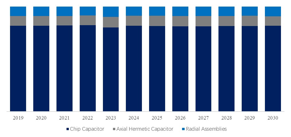 製品タイプ別では、チップコンデンサが最大のセグメントであり、80%以上を占めている。