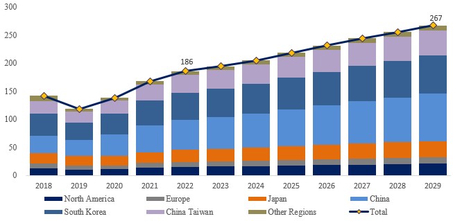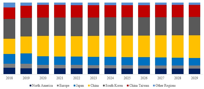 地域別では、中国が最大の消費市場であり、市場シェアは28.7%を占める。次いで韓国が26.0%、台湾が17.4%となっている。中国は2023年から2029年にかけて年平均成長率(CAGR)約6.8%で最も急速な成長が見込まれる。