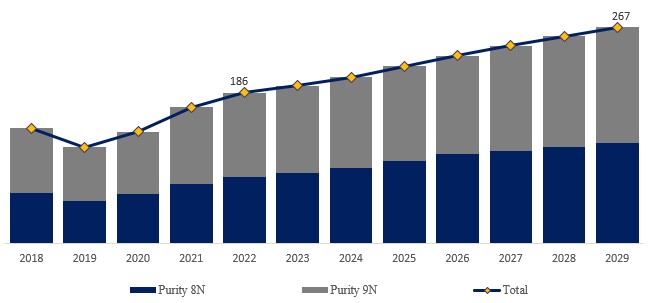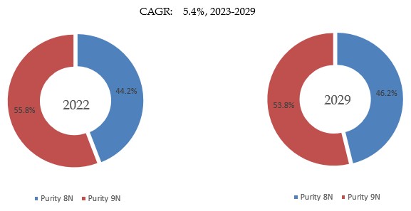 製品タイプ別では、純度9Nが最大のセグメントであり、2022年の収益ベースで55.8%のシェアを占め、次いで純度8Nが44.2%を占めた。
