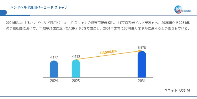ハンドヘルド汎用バーコード スキャナの世界市場規模は2025年から2031年にかけて年平均成長率(CAGR)6.8%で拡大し、2031年には6578百万米ドル規模に達する見込みです。市場は2024年に4177百万米ドルと推定され、2025年には4433百万米ドルに達すると予測されています。