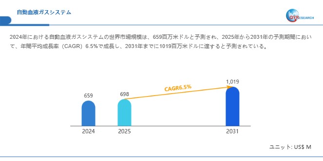 自動血液ガスシステムの世界市場規模は2025年から2031年にかけて年平均成長率(CAGR)6.5%で拡大し、2031年には1019百万米ドル規模に達する見込みです。市場は2024年に659百万米ドルと推定され、2025年には698百万米ドルに達すると予測されています。