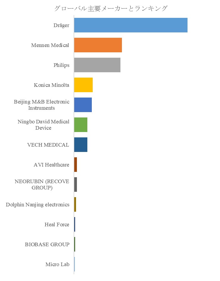 地域別に見ると、北米および欧州市場では、新生児医療体制が高度に整備されており、経皮ビリルビン測定器は既に標準的な診断補助機器として広く普及している。これらの地域では新規導入よりも、更新需要や上位機種への切り替えが市場を支えている。一方、アジア太平洋地域では出生数の多さと医療インフラ整備の進展を背景に、導入フェーズにある医療機関が多く、中長期的な成長余地が大きい。中国を中心とした新興市場では、価格競争力を持つローカルメーカーの存在感が増しており、市場構造に多様性をもたらしている。企業別では、Drägerを筆頭に、Mennen Medical、Philips、Konica Minoltaなどがグローバル市場で高い認知度を有し、技術力とブランド信頼性を武器に安定したポジションを確立している。上位企業は製品ラインアップの拡充と地域戦略の最適化を通じて、市場の成熟化に対応している。