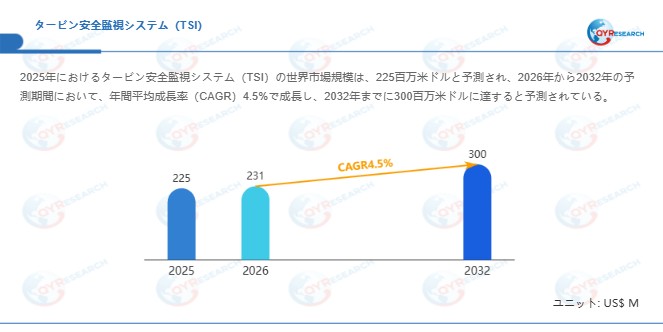 世界のタービン安全監視システム(TSI)市場は、発電所や石油化学プラントなどの重要インフラにおけるタービン設備の状態監視と異常停止防止に不可欠な基盤技術として、安定的な成長を続けている。2025年の世界市場規模は225百万ドルに達すると予測されています。2026年の世界市場規模は231百万ドルに達すると見込まれています。2026年から2032年の予測期間において、市場は年平均成長率(CAGR)4.5%で拡大し、2032年には300百万ドルに達すると予測されています。