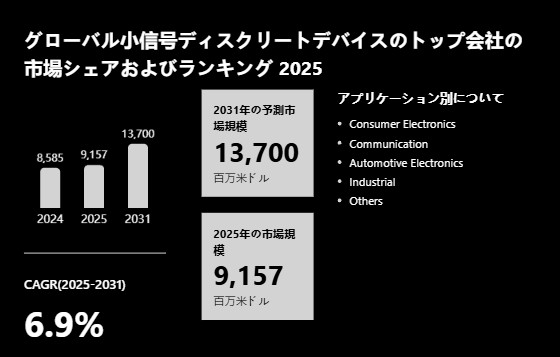 YHResearch調査チームの最新レポート「グローバル小信号ディスクリートデバイスのトップ会社の市場シェアおよびランキング 2026」によると、2025年の9157百万米ドルから2031年には13700百万米ドルに成長し、2025年から2031年の間にCAGRは6.9%になると予測されている。このレポートはのグローバル小信号ディスクリートデバイスの現状と今後の動向を調査および分析し、製品別、アプリケーション別、会社別、地域別と国別の小信号ディスクリートデバイスの市場規模を把握するのに役立つ。