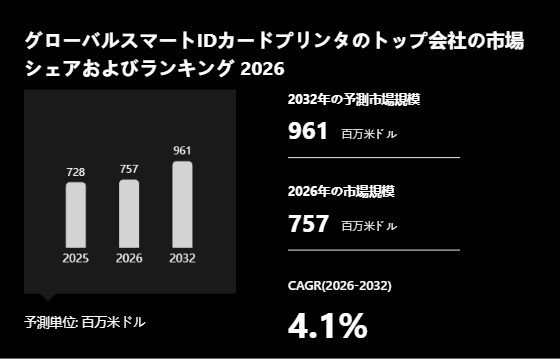 YHResearch調査チームの最新レポート「グローバルスマートIDカードプリンターのトップ会社の市場シェアおよびランキング 2026」によると、2026年の757百万米ドルから2032年には961百万米ドルに成長し、2026年から2031年の間にCAGRは4.1%になると予測されている。このレポートはのグローバルスマートIDカードプリンターのの現状と今後の動向を調査および分析し、製品別、アプリケーション別、会社別、地域別と国別のスマートIDカードプリンターの市場規模を把握するのに役立つ。