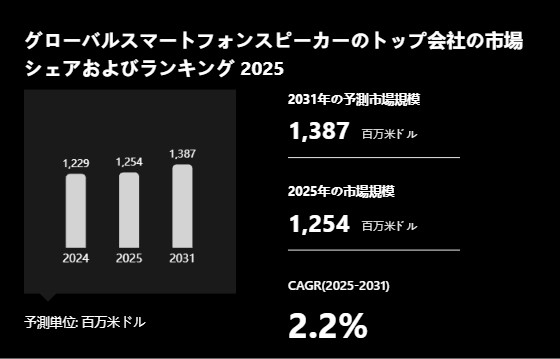 YHResearch調査チームの最新レポート「グローバルスマートフォンスピーカーのトップ会社の市場シェアおよびランキング 2026」によると、2025年の1254百万米ドルから2031年には1387百万米ドルに成長し、2025年から2031年の間にCAGRは2.2%になると予測されている。このレポートはのグローバルスマートフォンスピーカーの現状と今後の動向を調査および分析し、製品別、アプリケーション別、会社別、地域別と国別のスマートフォンスピーカーの市場規模を把握するのに役立つ。
