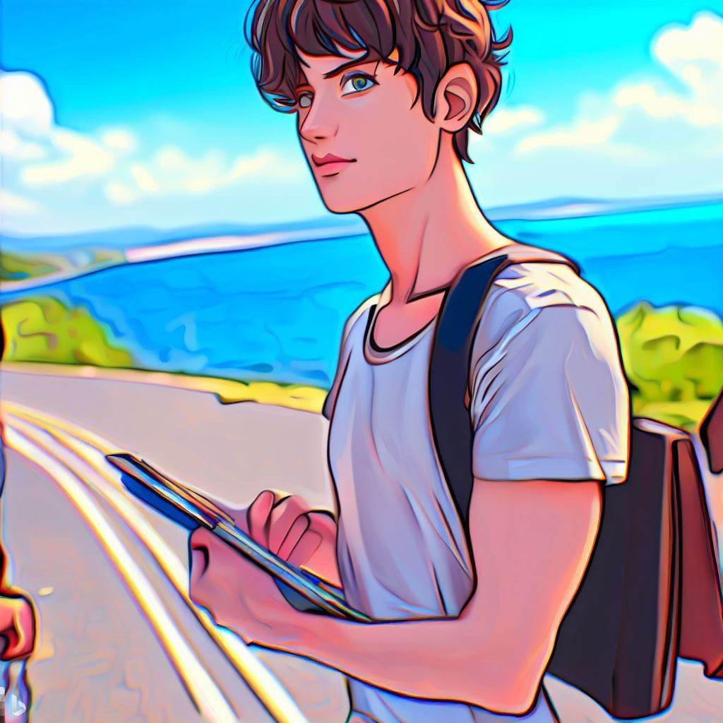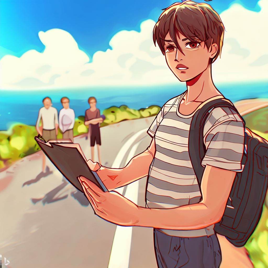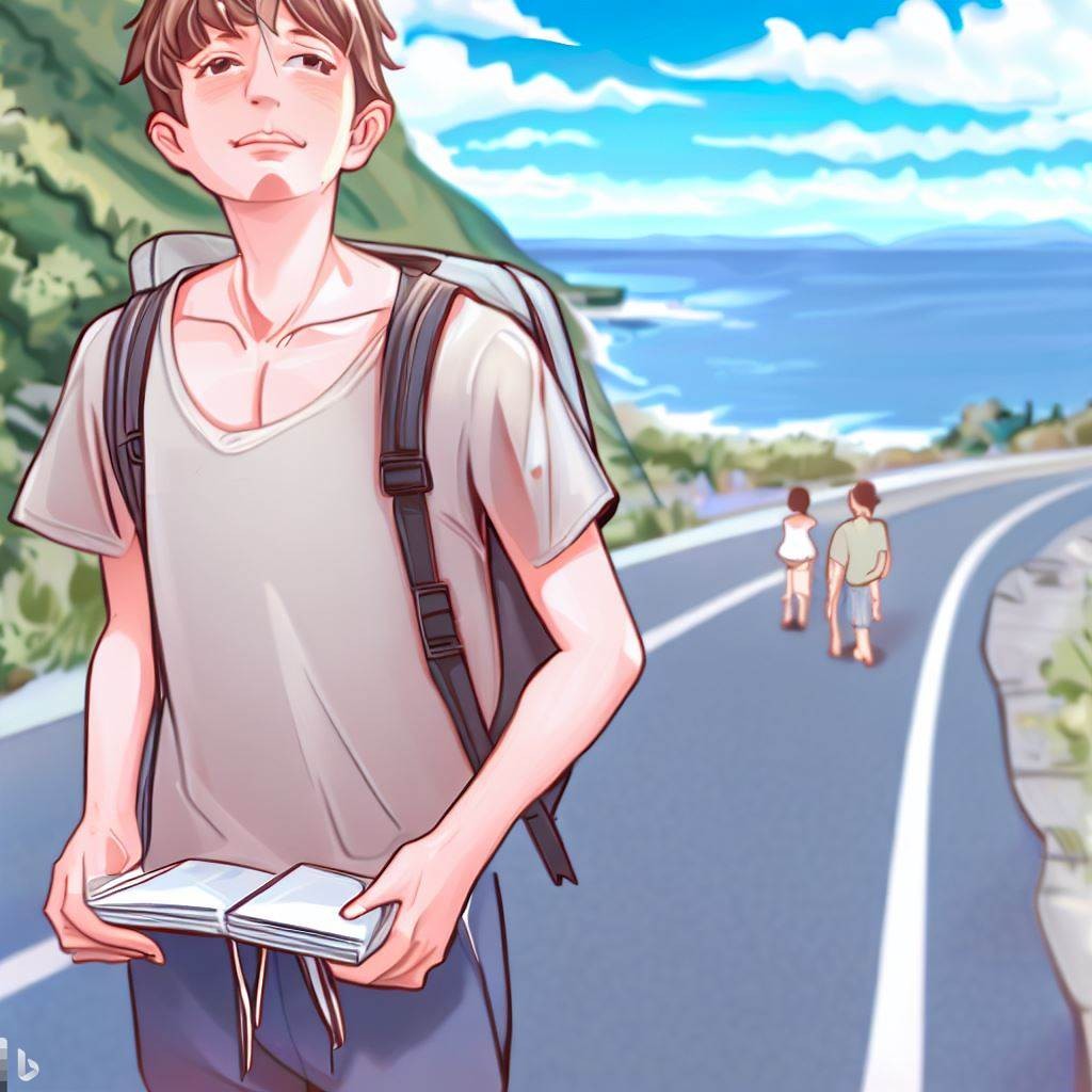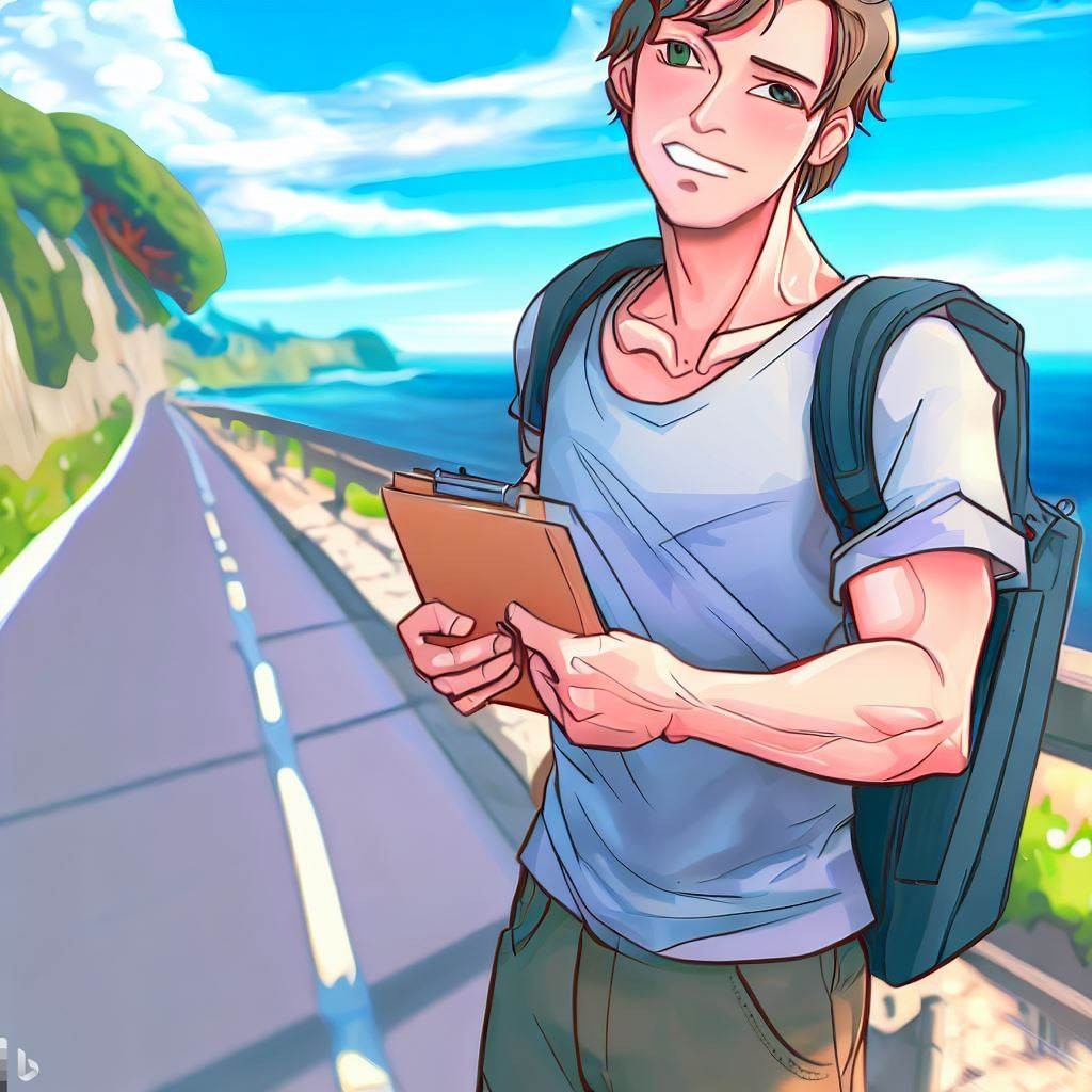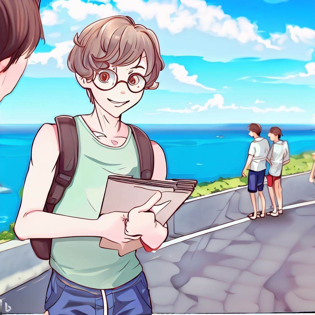 A cute, slightly muscular male student with circle-rimmed glasses is talking with students on a road by the sea, looking for a place to sketch. The cute male student is dressed in a short-sleeved shirt and shorts. Scenery of a national road along the coast. The landscape is angled from a person's 1.5-meter line of sight.3D AVATAR,Digital Art.