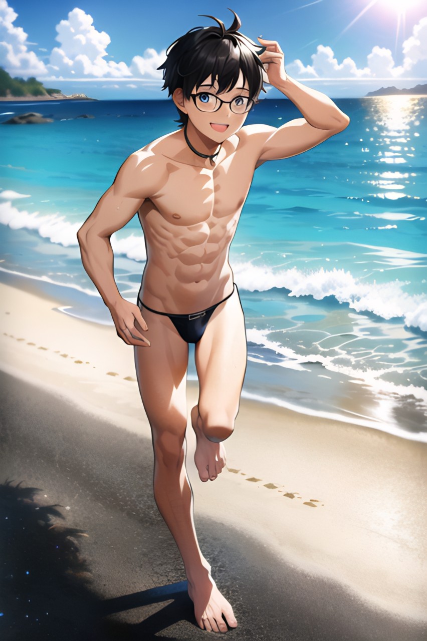 夏なので海水浴を題材にしました。この顔の表情は詳細に指定していません。《メガネをかけたかわいい15歳の少年》です。