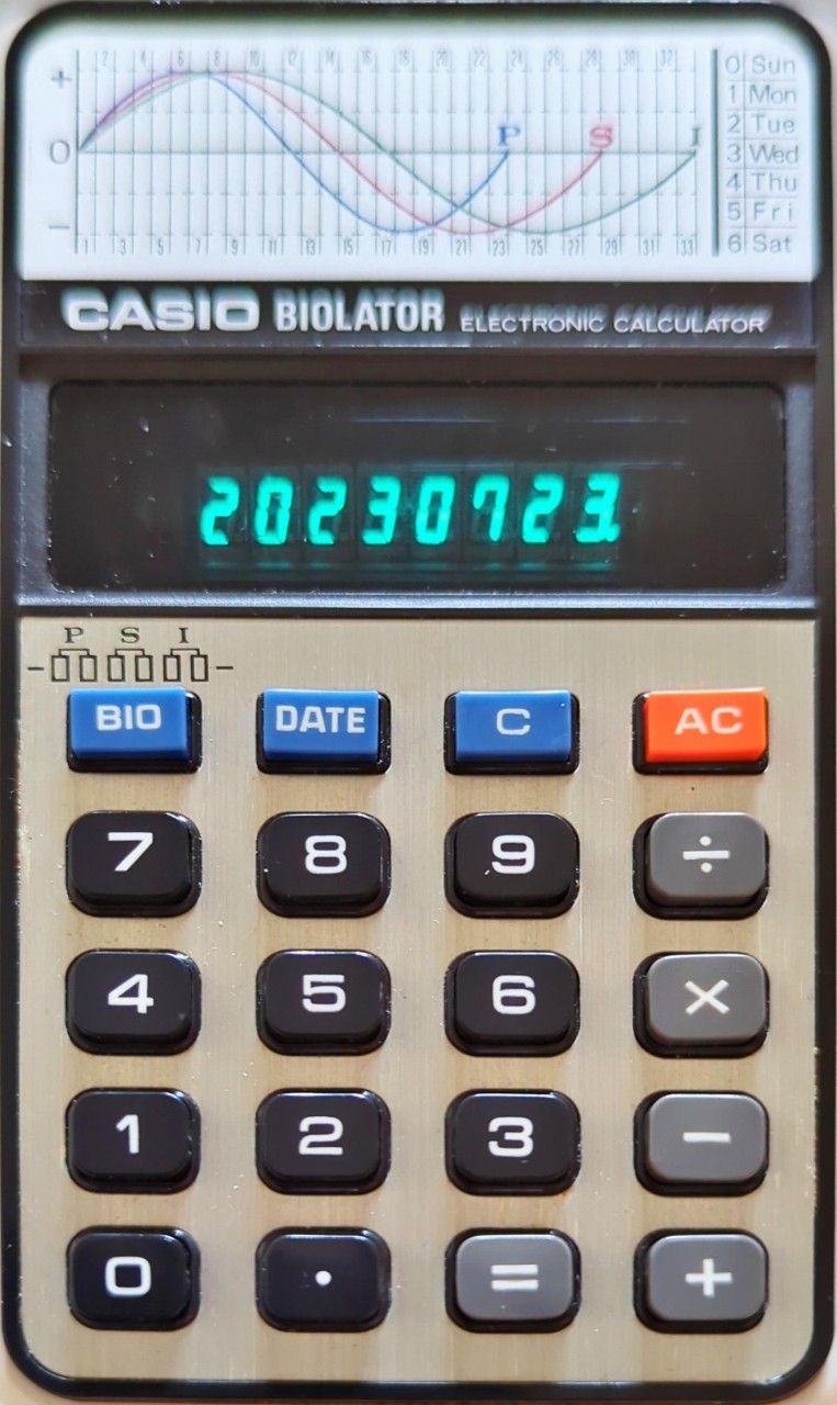 占い電卓。誕生日と今日の日付を入れるとバイオリズムが数字となって出てくる。ただし、2000年代は計算できない。蛍光管8桁の電卓。ポケットサイズ。電源は単三乾電池2本。