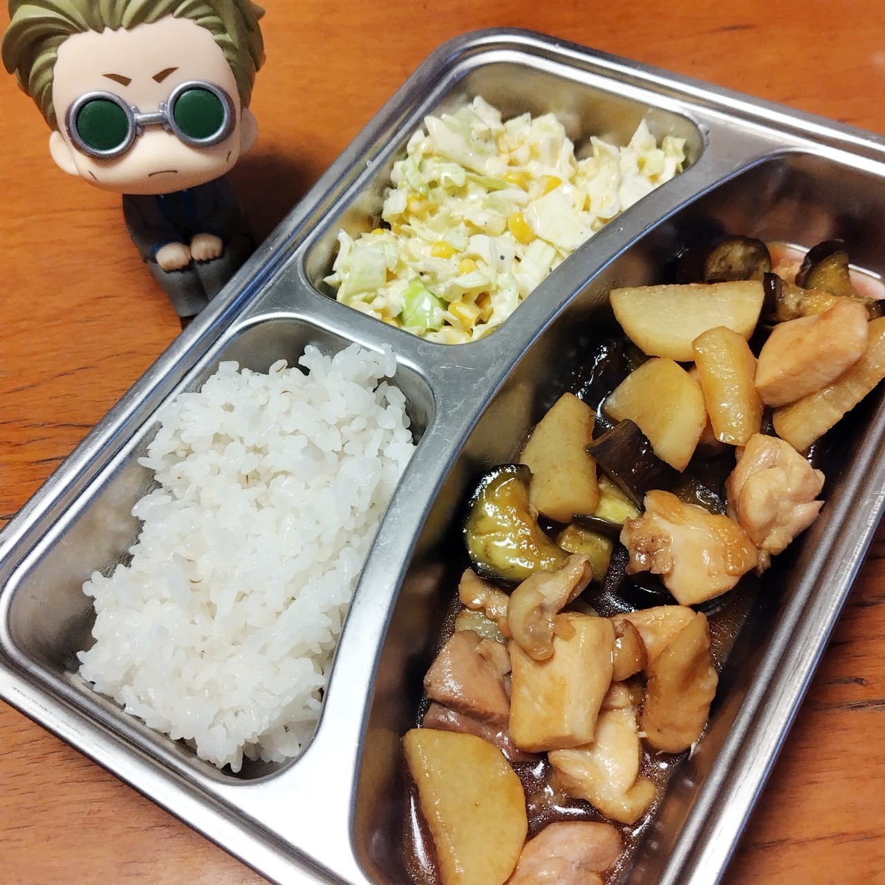 本日の夕食は鶏ももと長芋ナスの甘辛煮、キャベツとコーンのコールスロー、麦飯でありました。