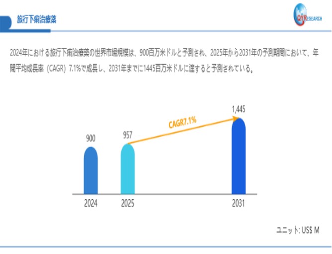 QYResearchが最新発表した「旅行下痢治療薬―グローバル市場シェアとランキング、全体の売上と需要予測、2026~2032」市場調査報告書によると、世界旅行下痢治療薬市場規模は2024年の約900百万米ドルから2025年には957百万米ドルへ着実に成長し、予測期間中に7.1%の複合年間成長率(CAGR)で拡大を続け、 2031年には1445百万米ドルに達する見込みである。
