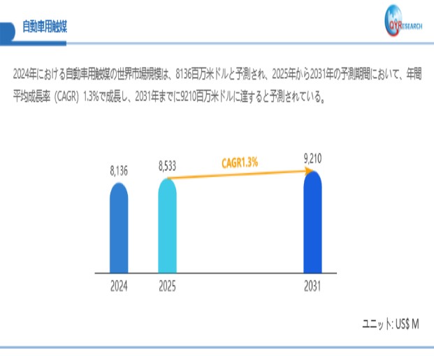 QYResearchが最新発表した「自動車用触媒―グローバル市場シェアとランキング、全体の売上と需要予測、2026~2032」市場調査報告書によると、世界自動車用触媒市場規模は2024年の約8136百万米ドルから2025年には8533百万米ドルへ着実に成長し、予測期間中に1.3%の複合年間成長率(CAGR)で拡大を続け、 2031年には9210百万米ドルに達する見込みである。