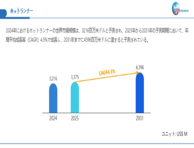 QYResearchが最新発表した「ホットランナー―グローバル市場シェアとランキング、全体の売上と需要予測、2026~2032」市場調査報告書によると、世界ホットランナー市場規模は2024年の約3216百万米ドルから2025年には3375百万米ドルへ着実に成長し、予測期間中に4.5%の複合年間成長率(CAGR)で拡大を続け、2031年には4396百万米ドルに達する見込みである。