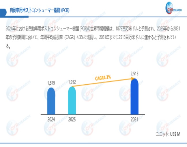 QYResearchが最新発表した「自動車用ポストコンシューマー樹脂 (PCR)―グローバル市場シェアとランキング、全体の売上と需要予測、2026~2032」市場調査報告書によると、世界自動車用ポストコンシューマー樹脂 (PCR)市場規模は2024年の約1879百万米ドルから2025年には1952百万米ドルへ着実に成長し、予測期間中に4.3%の複合年間成長率(CAGR)で拡大を続け、2031年には2513百万米ドルに達する見込みである。