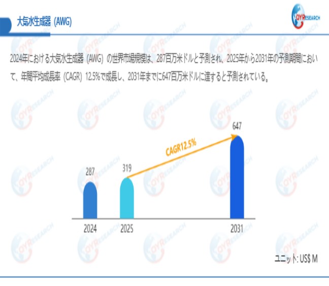 QYResearchが最新発表した「大気水生成器(AWG)―グローバル市場シェアとランキング、全体の売上と需要予測、2026~2032」市場調査報告書によると、世界大気水生成器(AWG)市場規模は2024年の約287百万米ドルから2025年には319百万米ドルへ着実に成長し、予測期間中に12.5%の複合年間成長率(CAGR)で拡大を続け、2031年には647百万米ドルに達する見込みである。