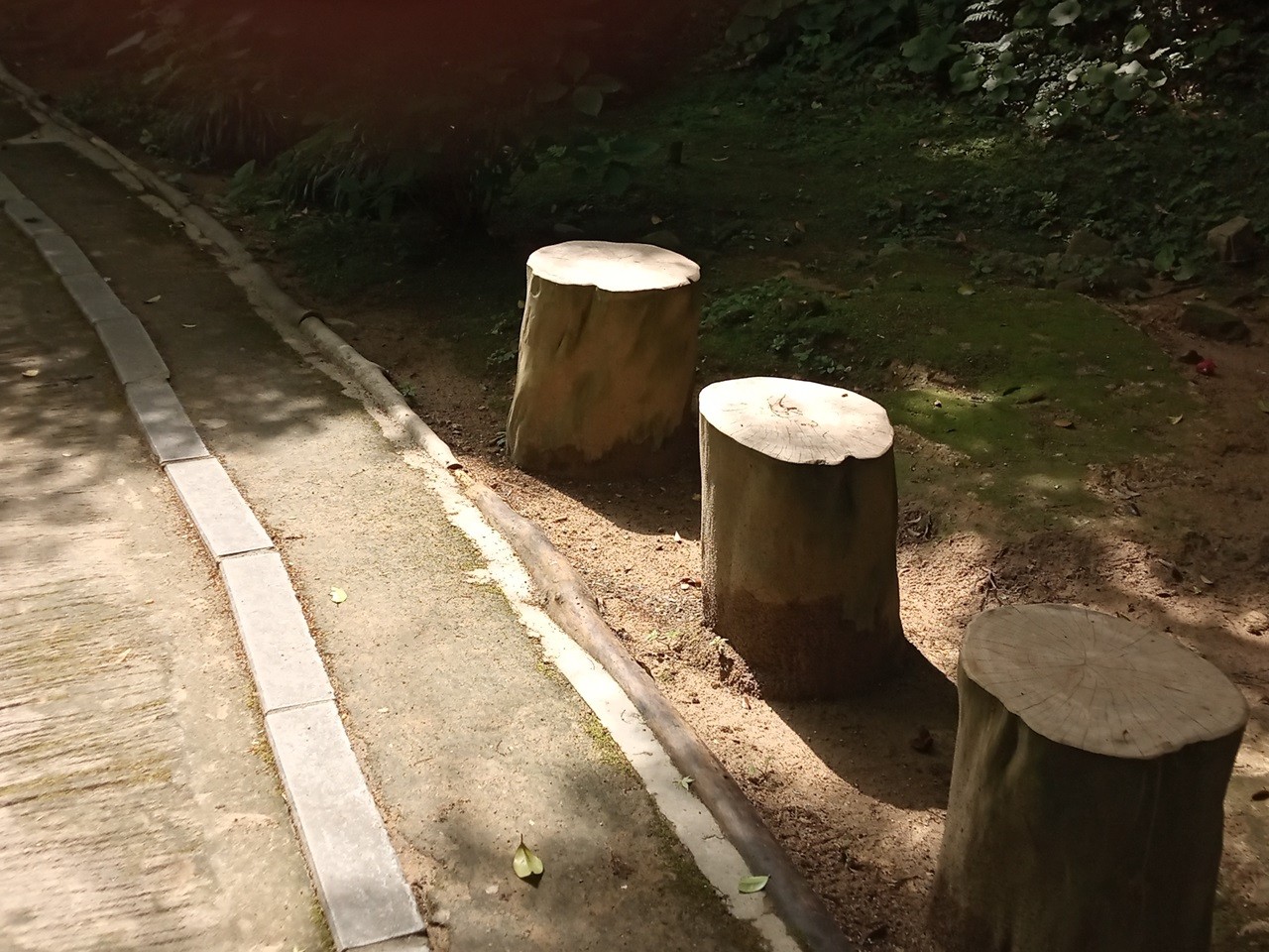 とある公園を歩いていたら、切り株みたいなベンチが、朝の陽光に照らされていました。光が明るく輝くほど、その周囲は暗い影になるんだね。