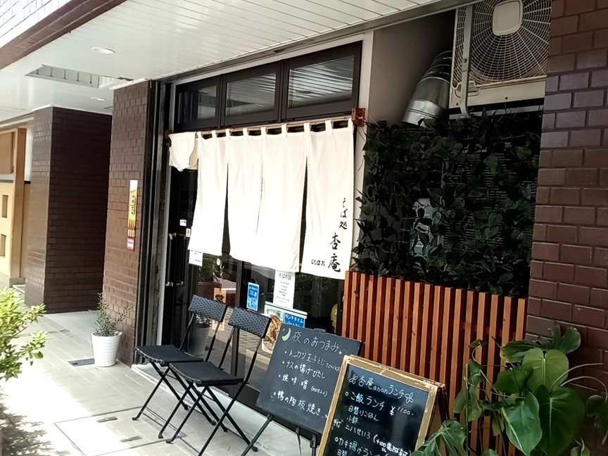 武蔵が辻にある「ホテルリソルトリニティ」の左側の小路を入ってゆくと、右手にマンションがあります。1Fはテナントの店舗で、左端が「ワインでお鮨を」の「かた田」。右端は、古本屋の「加越屋書店」、そして真ん中が「そば処 杏庵」ですね。今回、ランチで初入店です。