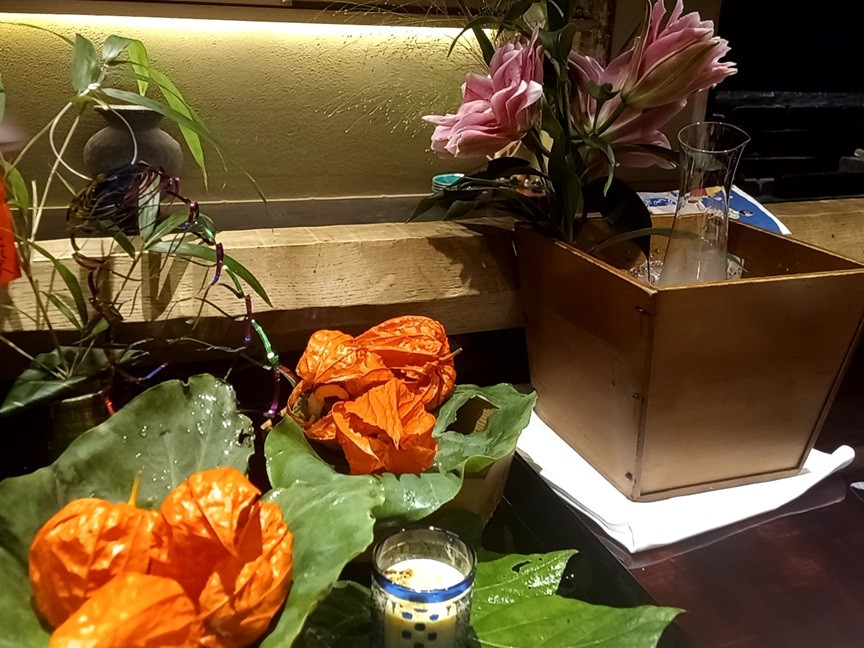 舌も目も楽しませてくれる料理が次々と出てきます。まさに「映える料理」です。この日はカウンター8席は満席で、二人連れ✖4組です。大将は料理に全力投球で、客との会話は女将さんが一致に引き受けてくれましたが、この女将さんのトークがまたユーモアとウイットにあふれ「客とのおしゃべりも味のうち」と実感します。実は大将もまたユーモアあふれる方なのですが、これは次回のお愉しみとしましょう。