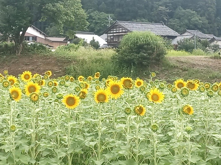 旧鳥越村の道の駅『一向一揆の里』の右隣に、ひまわり畑があります。ひまわりにもいろんな品種があるのか、背の高い大きなひまわりではなく、程よい背丈のひだまりが咲き誇っています。