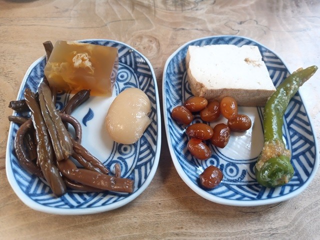 そばが来る前に、女将さんお手製の山菜や野菜の「小鉢」が供されます。これがまたほのぼのと滋味あるれる一品です。