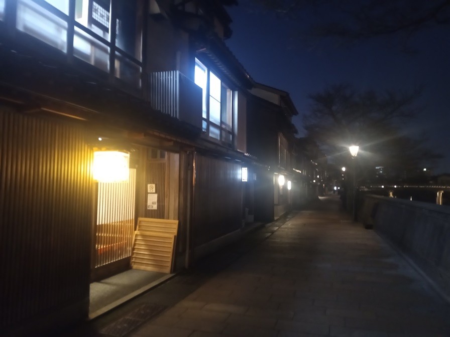ひがし茶屋街もそうですが、無駄な灯りがないのがいいですよね。今宵は歩く人もおらず、それはそれは静かな散策を楽しめました。桜の季節になると、この界隈も賑やかになると思います。