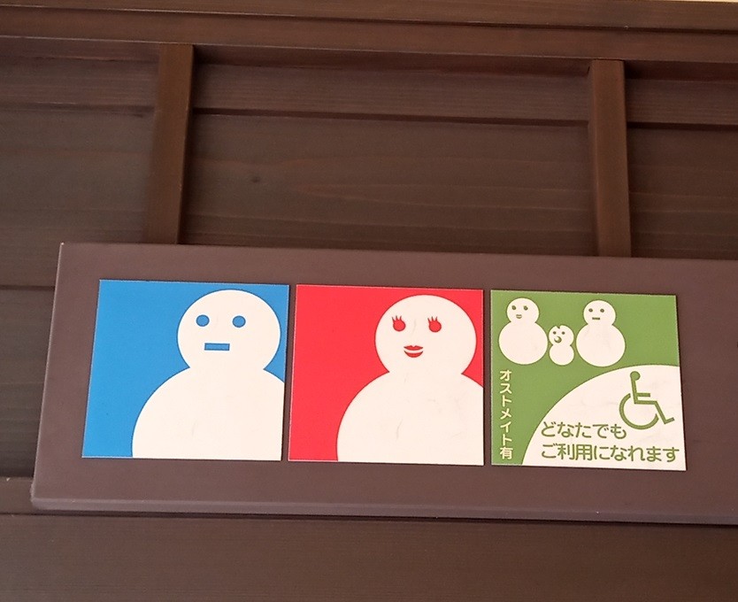 総湯前の広場にある土産物やさんに併設されたトイレには、色鮮やかな雪だるまさんの標識が。まあ、いろんな意味で昭和チックなデザインですが、小生、こういうのが好きやねん、です。