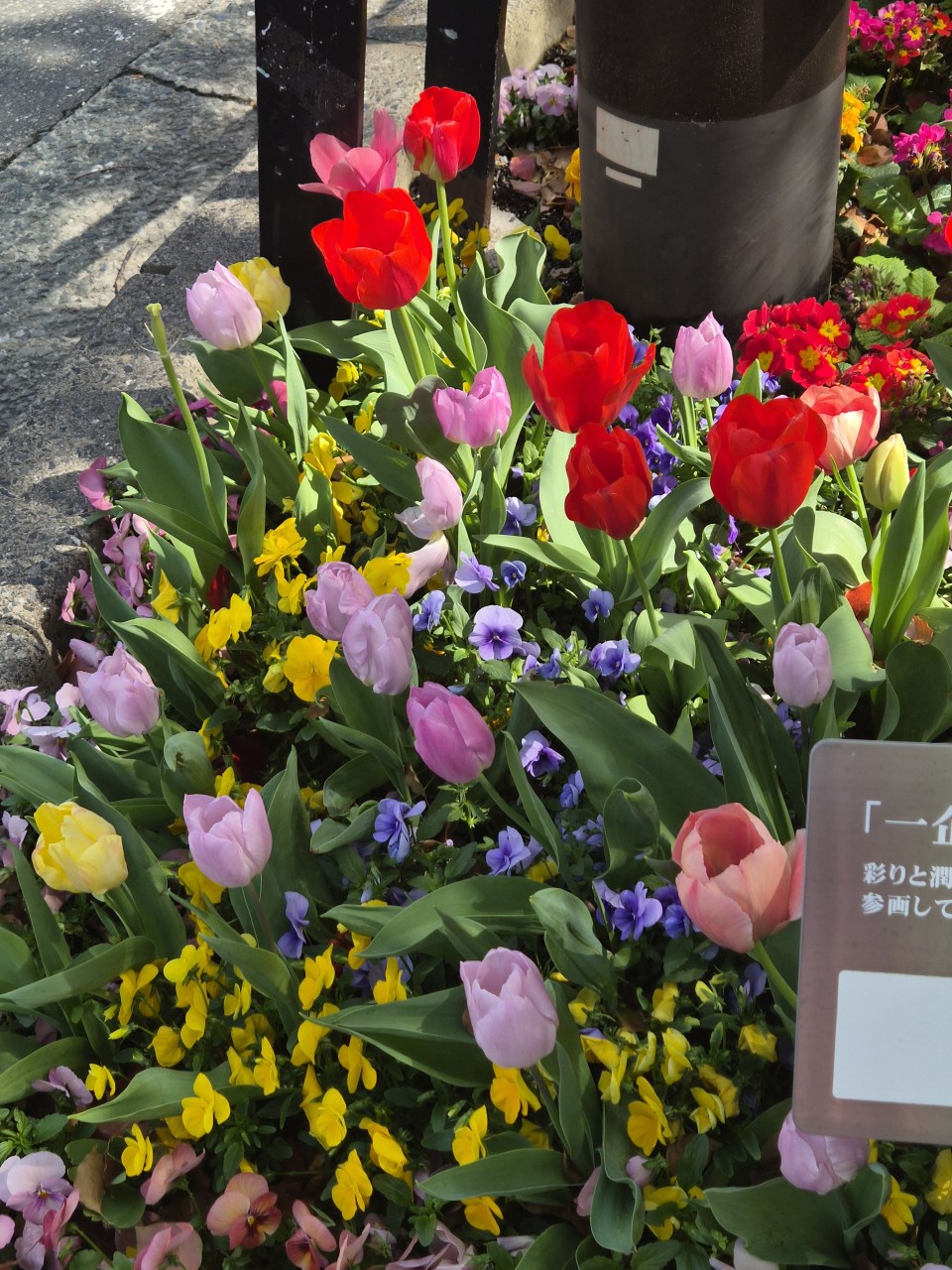 市がやっているのか県がやっているのかは分からないが、「一人一花運動」というのをやっているようで、天神のあちこちに花壇が設けられていて、チューリップ等の花が咲いていて見事だった。