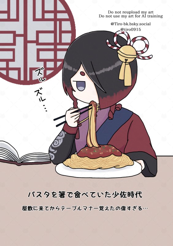 最近☔のカドストを読み直ししてたんですけど、初期のカドストで「東の大地にいた時はパスタは箸で食べてた」っていうのがあって…👿🐏になってからテーブルマナー覚えるの大変だっただろうなって思って描きました