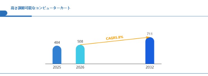 Global Reports調査チームの最新レポート「グローバル高さ調節可能なコンピューターカート市場規模、主要企業シェア、ランキング分析レポート【2026年版】」によると、2026年の508百万米ドルから2032年には711百万米ドルに成長し、2026年から2032年の間にCAGRは5.8%になると予測されています。