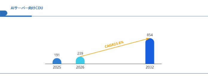 AIサーバー向けCDUの将来発展機会として最も大きいのは、生成AIや大規模モデルの普及によるAIサーバーの急増です。高密度GPUクラスタは従来サーバーの数倍の発熱を生み、液冷インフラの導入が不可欠となっています。AIサーバー向けCDUは冷却液の分配・温度制御を担う中核装置として、AIデータセンター新設や拡張に伴い継続的な需要拡大が見込まれます。市場規模も急成長が予測され、AIサーバー向けCDU関連市場は年平均約28%で拡大すると見込まれています。