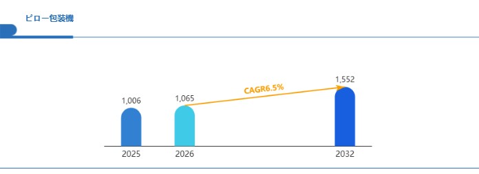 Global Reports調査チームの最新レポート「グローバルピロー包装機市場規模、主要企業シェア、ランキング分析レポート【2026年版】」によると、2026年の1065百万米ドルから2032年には1552百万米ドルに成長し、2026年から2032年の間にCAGRは6.5%になると予測されています。