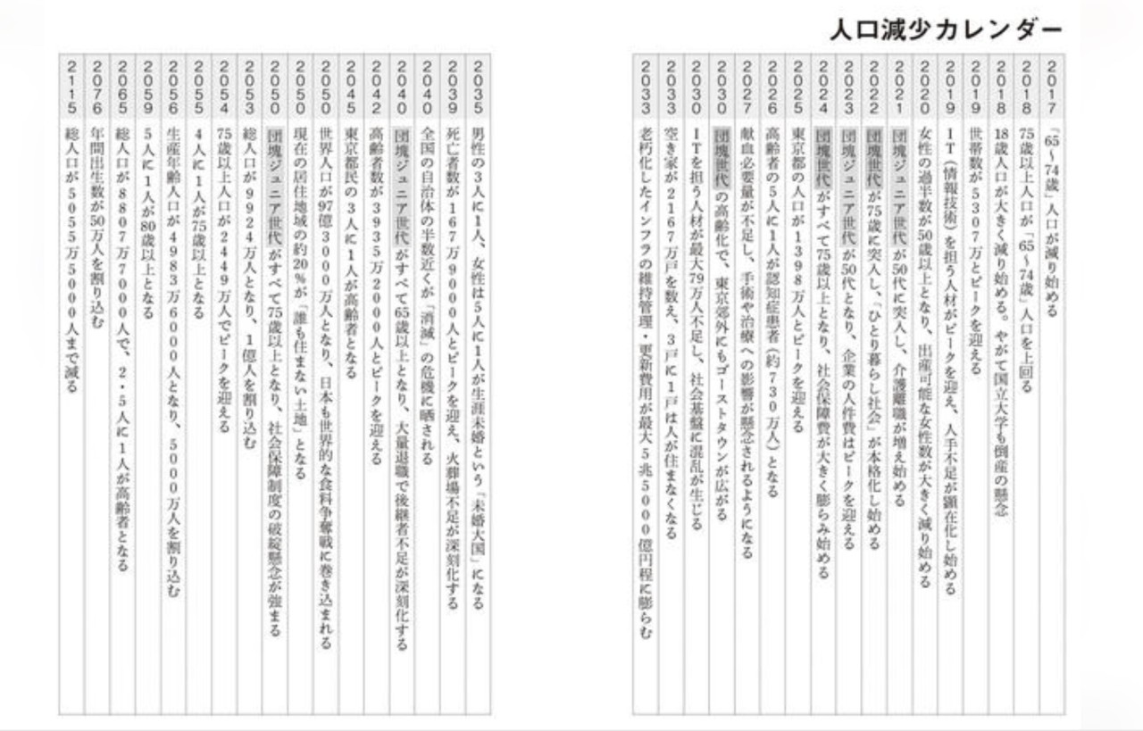 そこには、2115年までの人口減少カレンダーが掲載されていました。