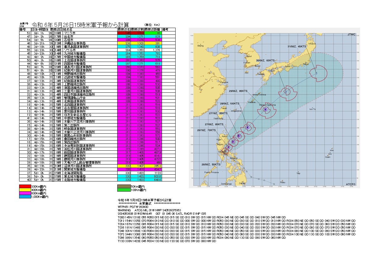米軍の進路予想から、台風1号が各地に接近する予想時刻と距離を計算しました。