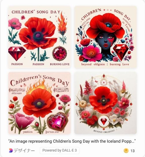 AIのDesignerにお願いして、私のイメージする童謡の世界を描いてもらった。すると、驚くべきことに、萌える赤と踊る華が描かれた絵が完成した。