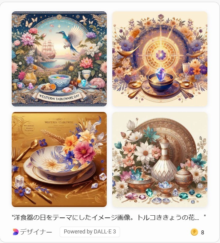 洋食器の日という特別な日を、AIのDesignerに描いてもらった絵で彩ることができて、とても嬉しい。今日の出来事は、私の心に深く残る素敵な思い出となった。洋食器の美しさに改めて気付かされた一日だった。