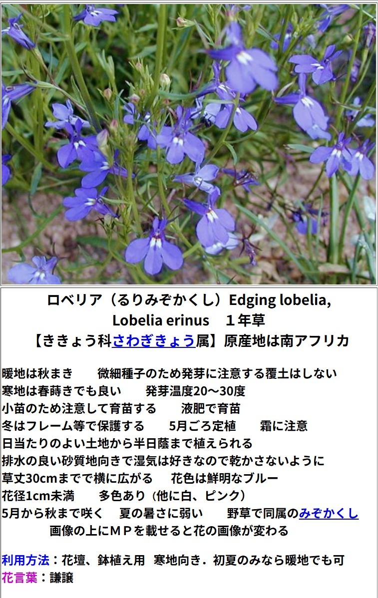 ロベリアはその美しい青い花が目を引くが、花言葉は「悪意なきいたづら」だという。