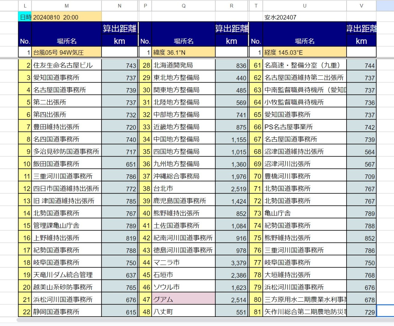 台風05号 94W気圧が20240810 20:00現在、各地点との概算距離が気になります。