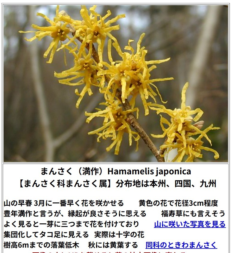 背景には広がる湿地の緑、そこに咲くマンサクの花。マンサクの花言葉は “霊感・呪文”。その名の通り、何か特別な力を宿しているような気がする。