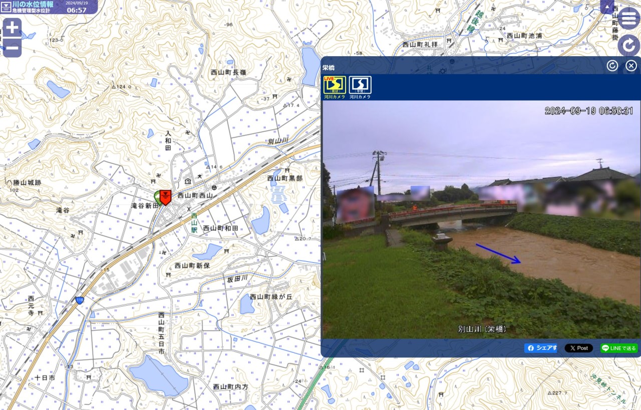 河川CCTVからの画像情報では、河川が増水し、岸辺や堤防に水が迫っている様子が伝わってきた。