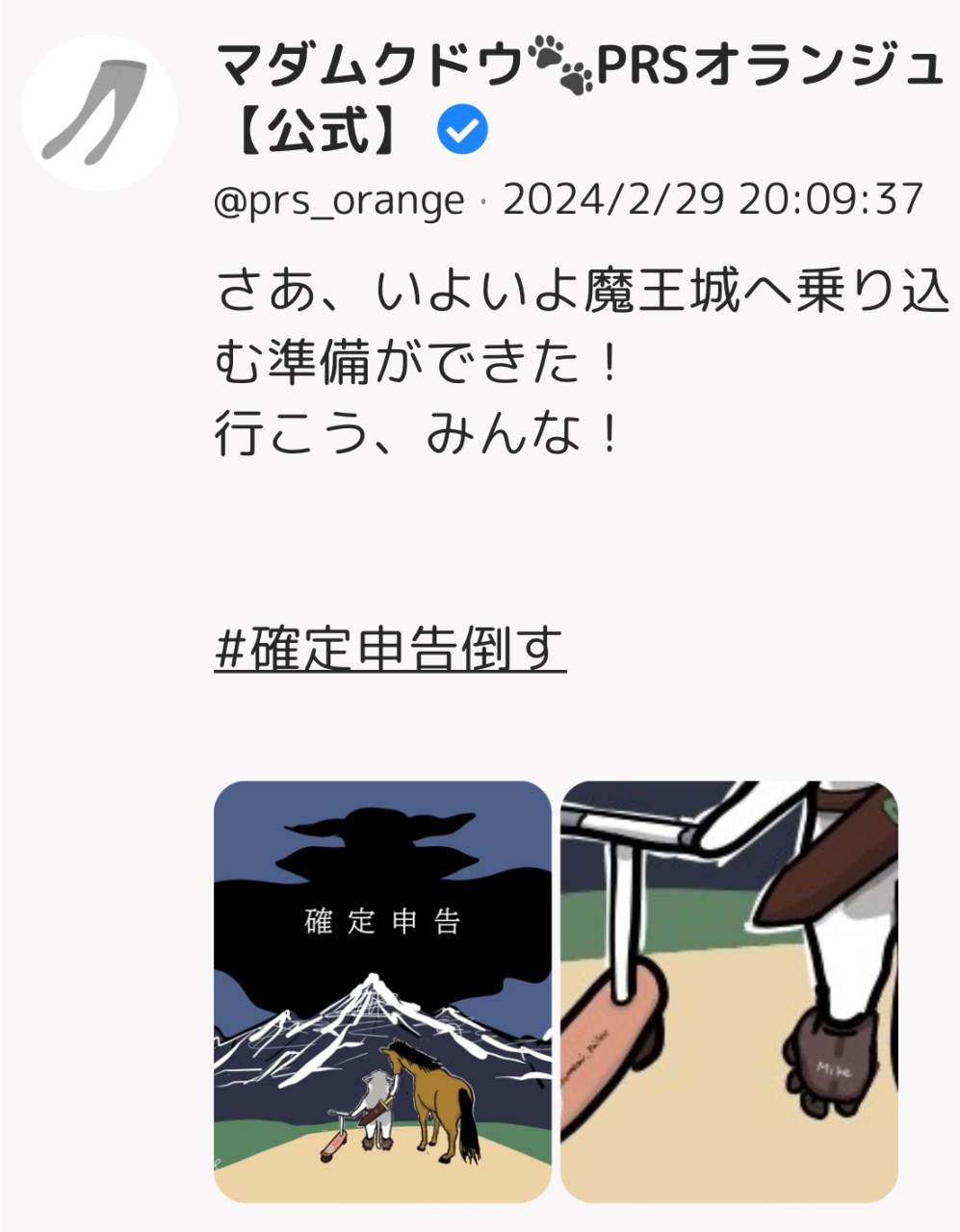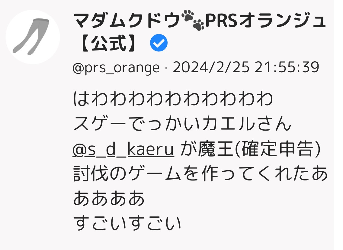 その中のオランジュとスゲーでっかいカエル(@s_d_kaeru)さんのやり取りの中から「確定申告を倒す」と言うゲームが生まれ、魔王と勇者マダム猫のキャラクターが誕生しました。