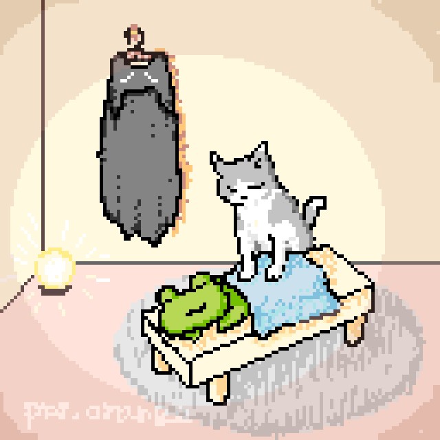 私が描いたリバーシしてサボるマダム猫の背後で「確定申告」の布を持つ魔王に似せてキャラを作ってくれたカエルさんすごい。
