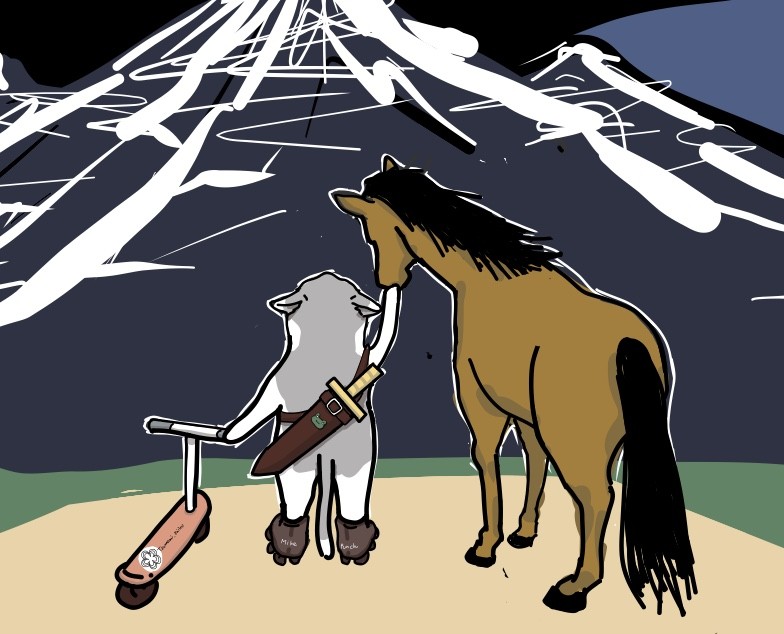 馬と、キックボードと、ローラースケートをどう取り入れたらいいのか考えに考えて、「仲間になってもらおう!」と閃きました。