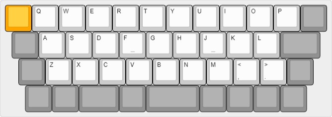 上の画像はKLE、Keyboard Layout Editor http://www.keyboard-layout-editor.com/ で呼び出せるPlanckのレイアウトだ。注目する点は、ホームポジションに指を置いた時の左右キーの割り当てだ。FとJに人差し指を置くと、ちょうど左右均等に分かれることになる。キーの使用回数における均等問題はここでは別問題のために棚に上げるが、どの指がどのキーを使うか、どこまで届くかという点に関してはとてもバランスが取れている。