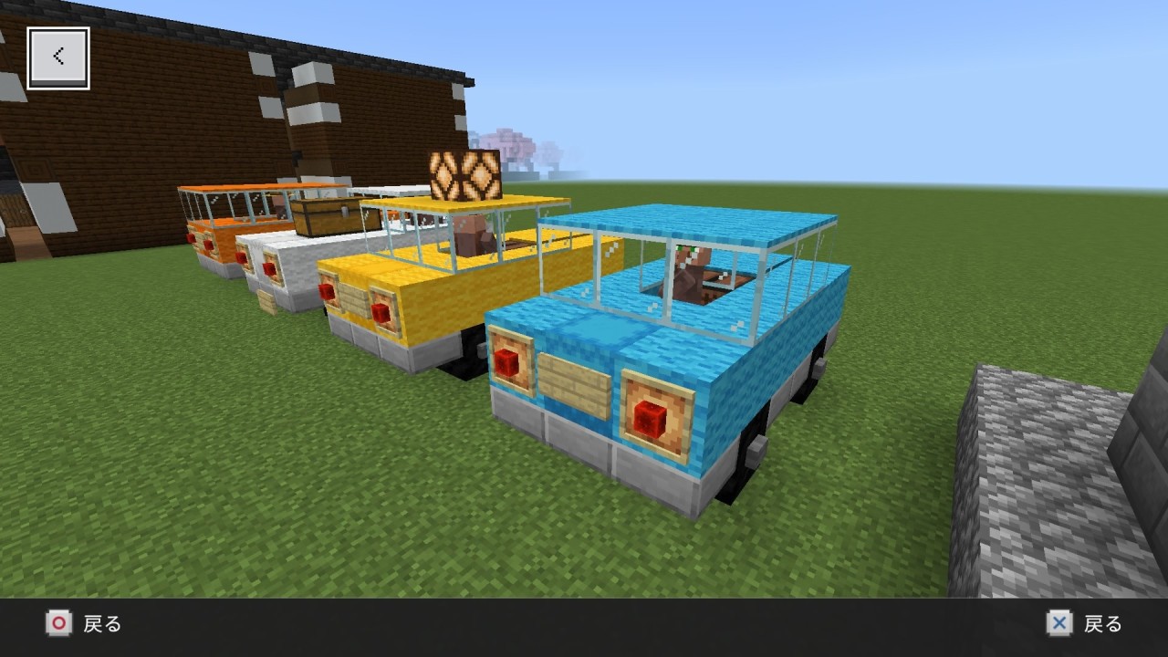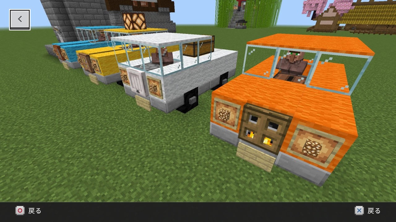 私はマイクラは中世ヨーロッパの世界だと思っているので(の割には時代劇的な和風建築ばかりしていますが…)現代的なものはあまり作りませんが、自動車を作ってみました。エンジンはかまどで、ジュークボックスのカーステレオ有りで、シュルカーボックスのトランク付きです。お好みで好きなデザインのトラップドアのグリルをお付けください
