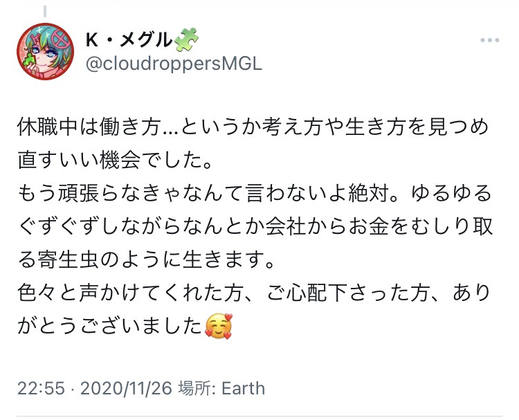 これは2020年の8月〜11月に同じ理由で休職してた頃のツイート。