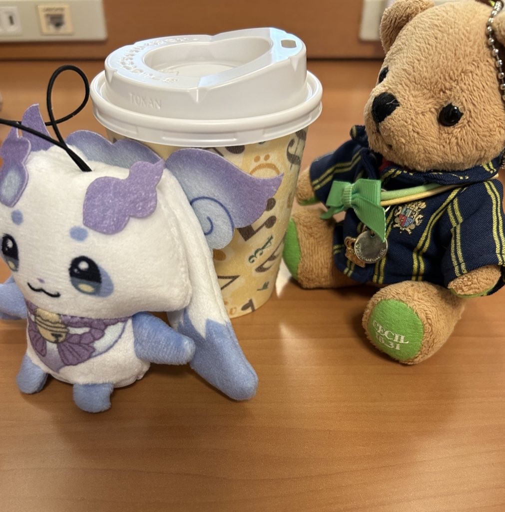 音符の付いたカップを眺めるセシくまと、前に行っちゃうぱぺちょまの図。
