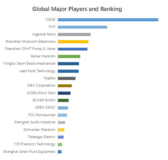 QYResearchのトップ企業研究センターによると、マイクロポンプの世界的な主要製造業者には、CEME、KNF、Ingersoll Rand、Shenzhen Skoocom Electronics、Shenzhen CNHT Pump & Valve、Parker Hannifin、Ningbo Jiayin Electromechanical、Lead Fluid Technology、Topsflo、IDEX Corporationなどが含まれている。2023年、世界のトップ5企業は売上の観点から約18.0%の市場シェアを持っていた。