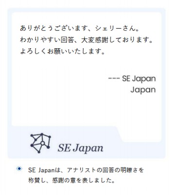 「ありがとうございます、シェりーさん。わかりやすい回答、大変感謝しております。よろしくお願いいたします。」